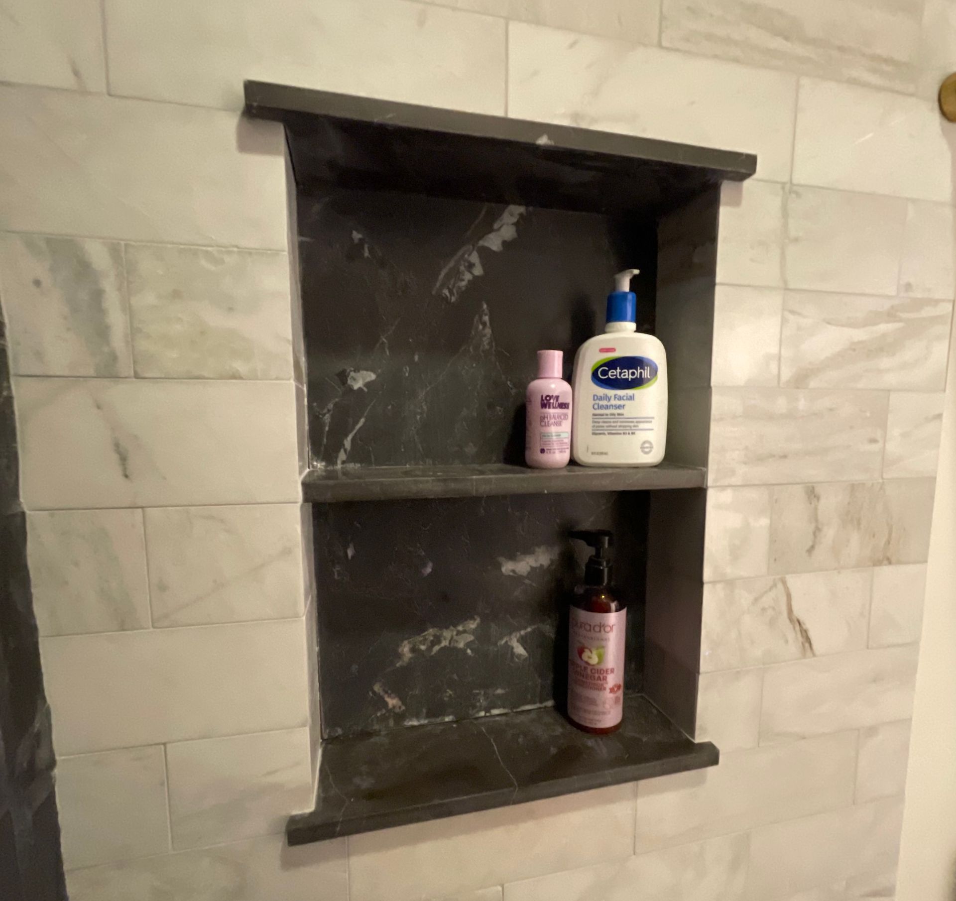 2. Stone slab accent trim shower niche