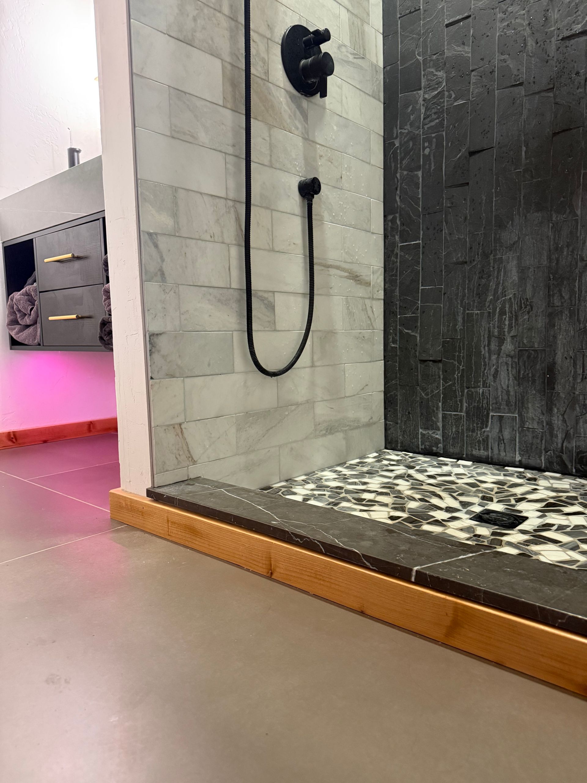 Using this method, shower wall tile is used under a stone curb top to match the shower wall tiles. This blends the look of the shower down to the floor under the curb top.